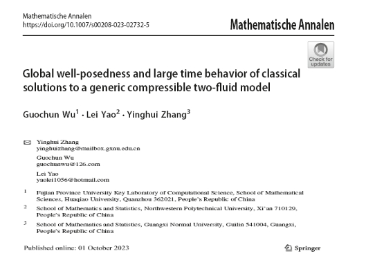 再次以第一单位在国际数学类顶级学术期刊《德国数学年刊》(Mathematische Annalen)发表论文。论文题为《Global well-posedness and large time behavior of classical solutions to a generic compressible two-fluid model》,是我校成人社区