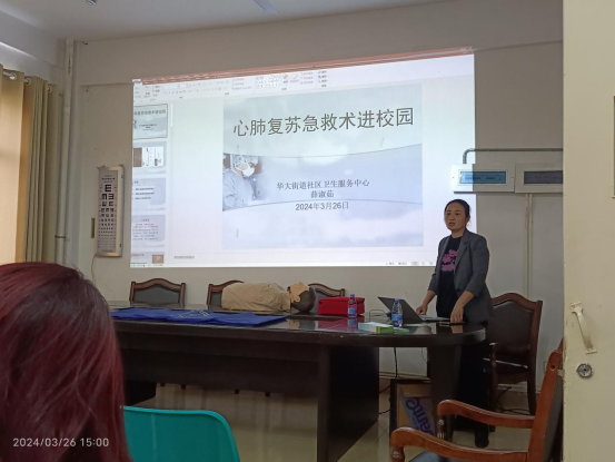 活动伊始,华大街道社区卫生服务中心薛淑茹首先通过生动的案例和专业的讲解,向在场师生阐述了掌握急救技能的重要性和必要性。并指出,在紧急情况下,正确的急救措施往往能为患者争取到宝贵的抢救时间,降低死亡率。特别是心肺复苏,作为急救技能中的核心部分,对于心跳骤停患者的抢救至关重要。