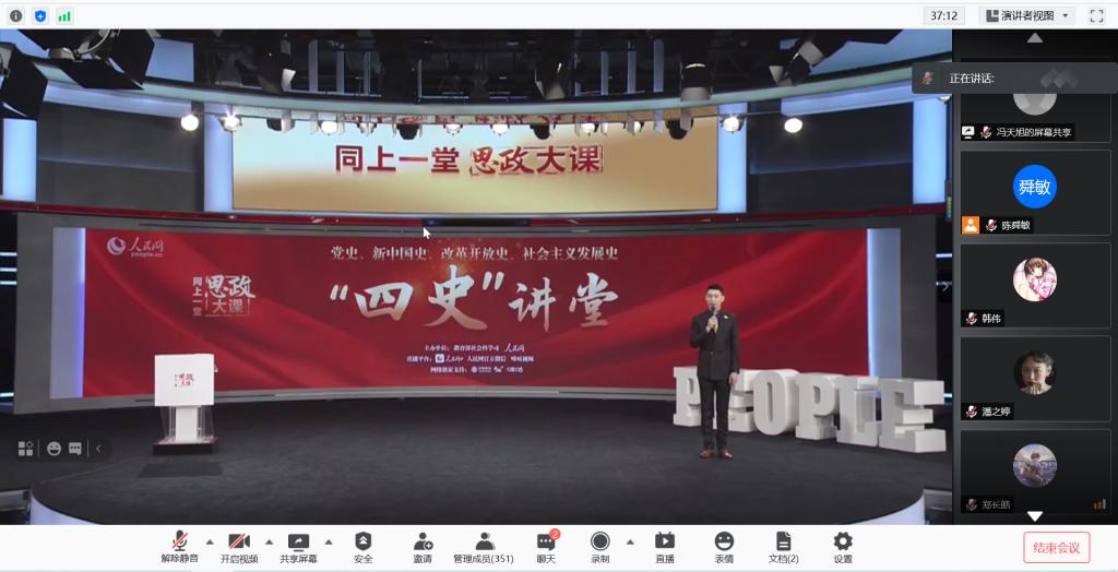 为深入贯彻落实习近平总书记关于深化思想政治理论课改革创新和“大思政课”的重要指示批示精神,全面落实习近平总书记在党史学习教育动员大会上的重要讲话精神和《中共中央关于在全党开展党史学习教育的通知》的部署安排。4月24日下午,成人社区 组织开展“同上‘四史’思政大课”线上集中学习活动,学院党委书记陈英文,团委书记王雷及辅导员陈舜敏,学生党员、青年团员共计350余人参加了此次思政大课学习。