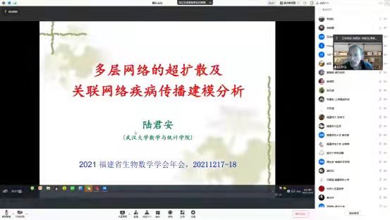 承办的2021年福建省生物数学学会年圆满完成。由于受疫情影响,本次年会采用云端会议的形式,来自武汉大学、加拿大York大学、华东师范大学、天津工业大学、厦门大学、福州大学、福建师范大学和福建农林大学等20余所院校的100多位专家出席了会议。我院副院长陈行堤教授担任开幕仪式主持人。