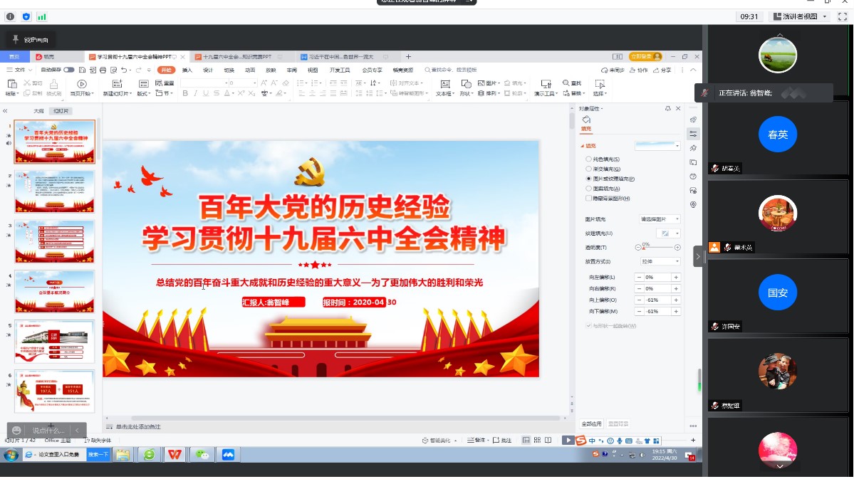 泉州教工第二党支部在线上开展“百年大党的历史经验学习贯彻十九届六中全会精神”的党课活动。支部书记翁智峰主持会议。