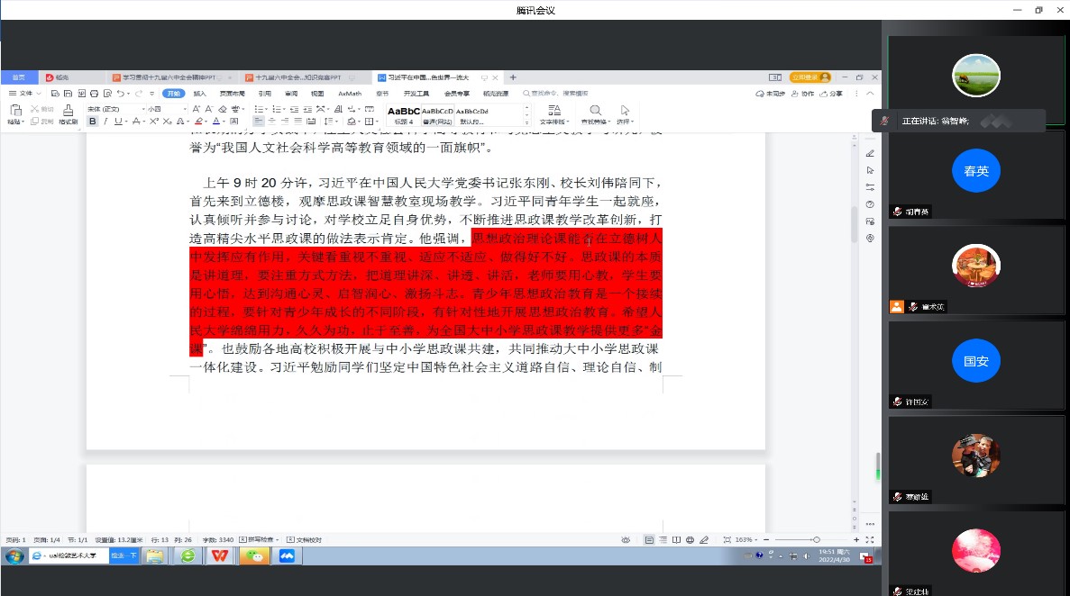 随后,支部党员围绕学习“习近平总书记在中国人民大学考察时的重要讲话精神”,交流学习心得体会。支部党员纷纷发言表示,要积极提升育人效果,强化“大思政”的教学理念,将思想政治教育融入教学过程之中并有所创新;教师不仅要传道授业,还要做学生的引路人,教师要全方位提升自己,为学生树立好榜样,传递正能量,在日常的工作和教学中,将思政理论潜移默化的传递给学生,提升学生的自信心和积极性,鼓励他们奋发向上,成为全面发展的新时代人才;要深挖课程思政元素,将课程思政有机融入课程建设全过程,作为课程设计和教学资源建设的重要内容,力争做到课课有思政,为学生上好每一节课,认真倾听学生的心声,将自己的热情融入到课堂教学中,促进学生德智体美劳全面发展。