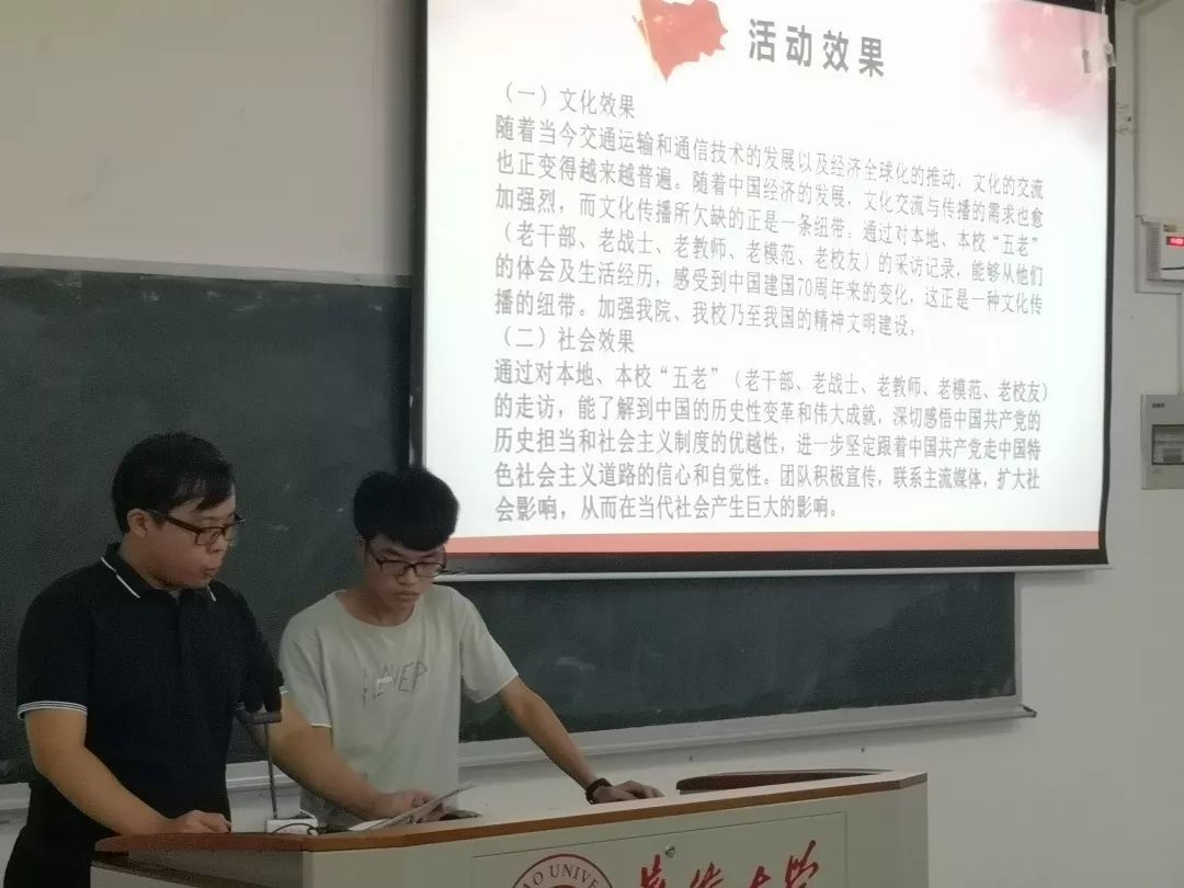 实践团汇报完毕后,兼职辅导员陈舜敏学长进行了总结。他从社会实践的目的和意义指出参加社会实践在大学学习生活中的重要性,并从同学们汇报的主题内容的选择,汇报形式的呈现,学科优势的把握,科研创新的思考,新闻媒体的宣传这五个方面对各个实践团的汇报作出点评,肯定了同学的实践成果,也指出了其中的不足,希望同学通过此次社会实践收获课堂上所没有的经历,运用在今后的学习生活中。