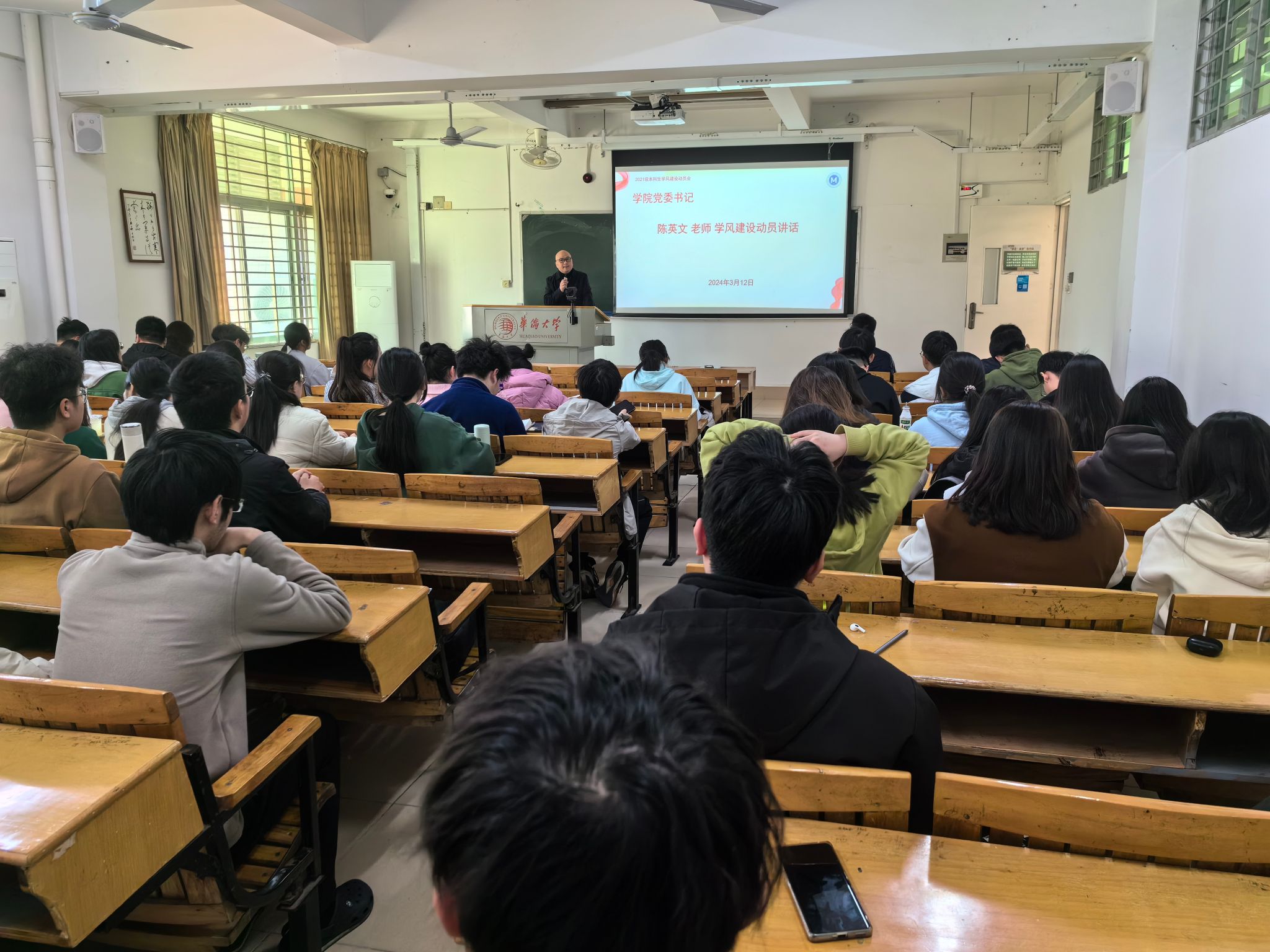 在动员会上,陈英文书记首先发言。他强调了学风建设的重要性,指出良好的学风是学院发展的基石,也是学生个人成长的关键。陈书记提醒目前已经是大三下学期,同学们要注意自己的学分修读情况。结合今年两会政府工作报告,他分析了当前数学专业同学未来就业面临的挑战和机遇,鼓励同学们聚焦未来就业、升学等目标,积极主动面对学习中的困难和挑战,不断提升自我,积极参与实践,让接下来的大学生活过得更加充实饱满。