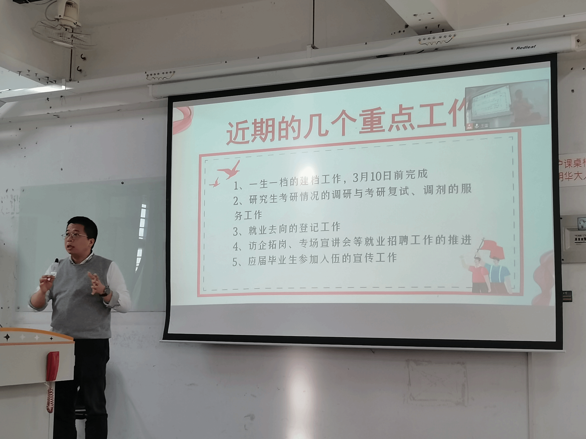 王雷对当前就业形势与考研、就业、档案等相关注意事项进行提醒,分析了当前大环境下的就业形势,并告知毕业生们几个关于考考研的复试与调剂、找工作以及毕业相关资料处理的重要的时间段与近期的几个重点工作。