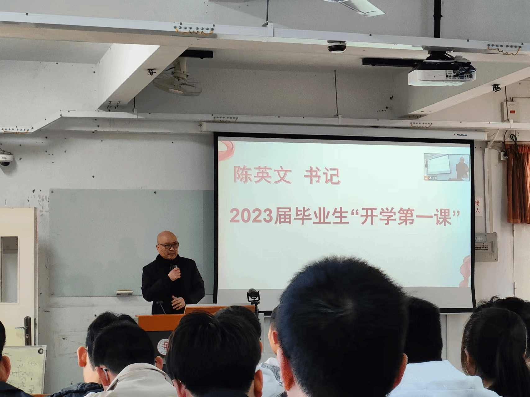 陈英文给2023届毕业生讲授“开学第一课”。他指出经过三年艰苦卓绝的斗争,如今疫情已经告一段落,我们迎来了崭新的开始,同学们也面临着人生新的选择和目标。时光的年轮铭刻着成长的轨迹,他强调作为新时代有志青年,眼里有光、心中有爱、肩上有责、脚下有力,积极投身乡村振兴、援疆援藏、疫情防控、志愿服务,把论文、实践、就业写在祖国的江河湖海上,把科技成果应用在实现社会主义现代化的伟大事业中,把青春热血挥洒在服务人民奉献社会中。