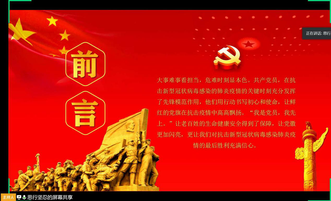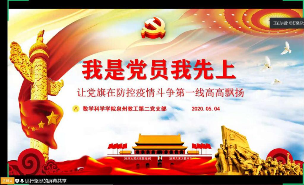 泉州教工第二党支部在腾讯会议平台开展“共抗疫情,发挥党员先锋模范作用”主题党课。支部全体党员参与会议,会议由支部书记翁智峰主持。